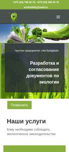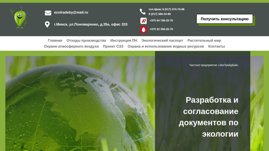 | AI-анализ | This website is the official page of the private enterprise "ЭкоТрейдБай" based in Minsk, Belarus. The company specializes in the development and approval of environmental documents. The website provides information on various services related to the implementation of environmental regulations, including waste management, production inspections, and the creation of an ecological passport for businesses. The main target audience includes large commercial and government organizations, as well as small and medium-sized businesses. The website offers a list of services and the related documentation, such as the instruction for production inspections and the ecological passport for businesses, as required by Belarusian law. The contact information for the company includes phone numbers and email addresses. |