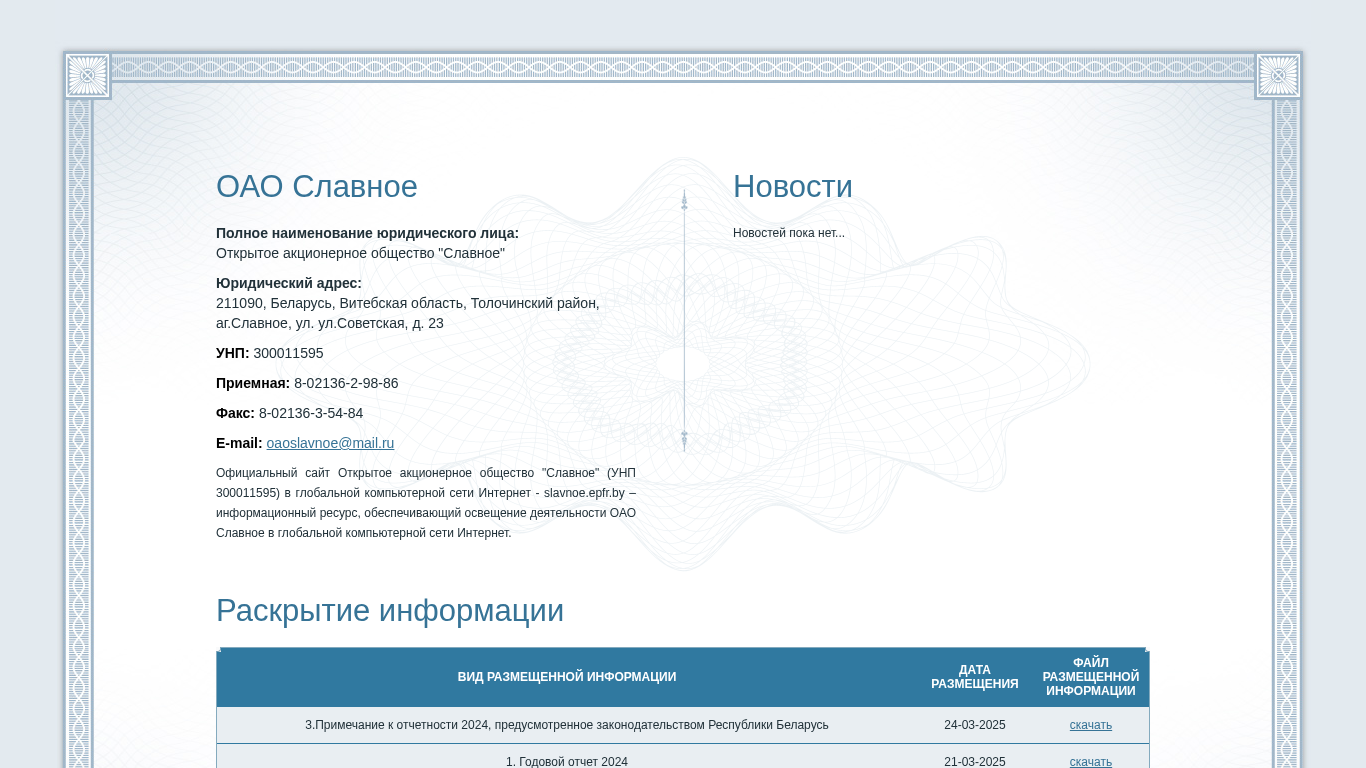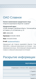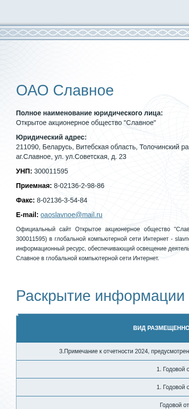 | AI-анализ | The website is the official information resource of Open Joint Stock Company (OJSC) "Slavnoe" (UNP 300011595), located in Belarus, Vitsebsk region, Tolochnitsky district, village of Slavnoe, Sovietskaya Street, house 23. The website provides information about the company's activities in the global computer network Internet. It includes various reports, such as annual reports for the years 2020, 2019, 2018, and 2024, which can be downloaded. The website also includes a section for accessing a personal cabinet, requiring email and password for login. The main keywords associated with the website are "Славное", "скачать", "годовой", "отчет", "оао", "пароль |