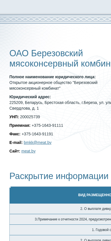 | AI-анализ | The web project "Березовский мясоконсервный комбинат ОАО" (Berezovsky Meat Canning Combine OJSC) is a Belarusian company specializing in meat processing and canning. The website, meat.by, provides information about the organization, including its full legal name, juridical address, and UNP number. The site primarily features announcements for various shareholder meetings, with a total of 18 such announcements listed between March 2020 and March 2025. These meetings include both regular annual general meetings and extraordinary meetings. The site also includes contact information, such as a phone number, fax number, and email address, for inquiries or communications with the company. |