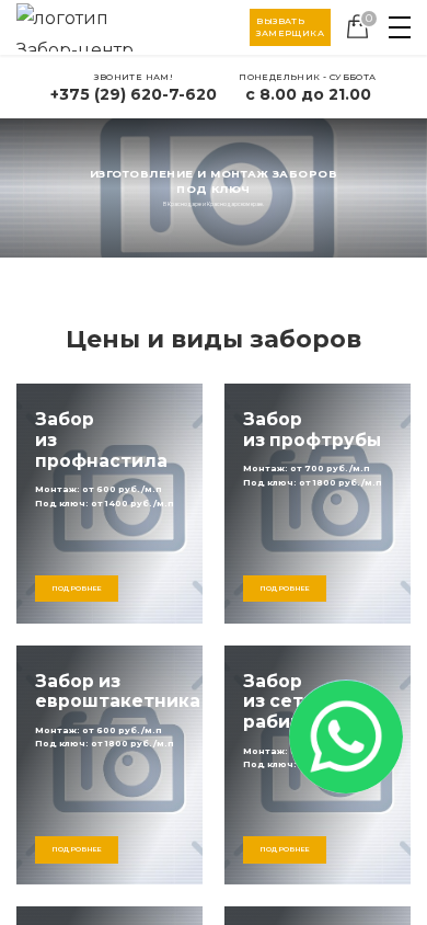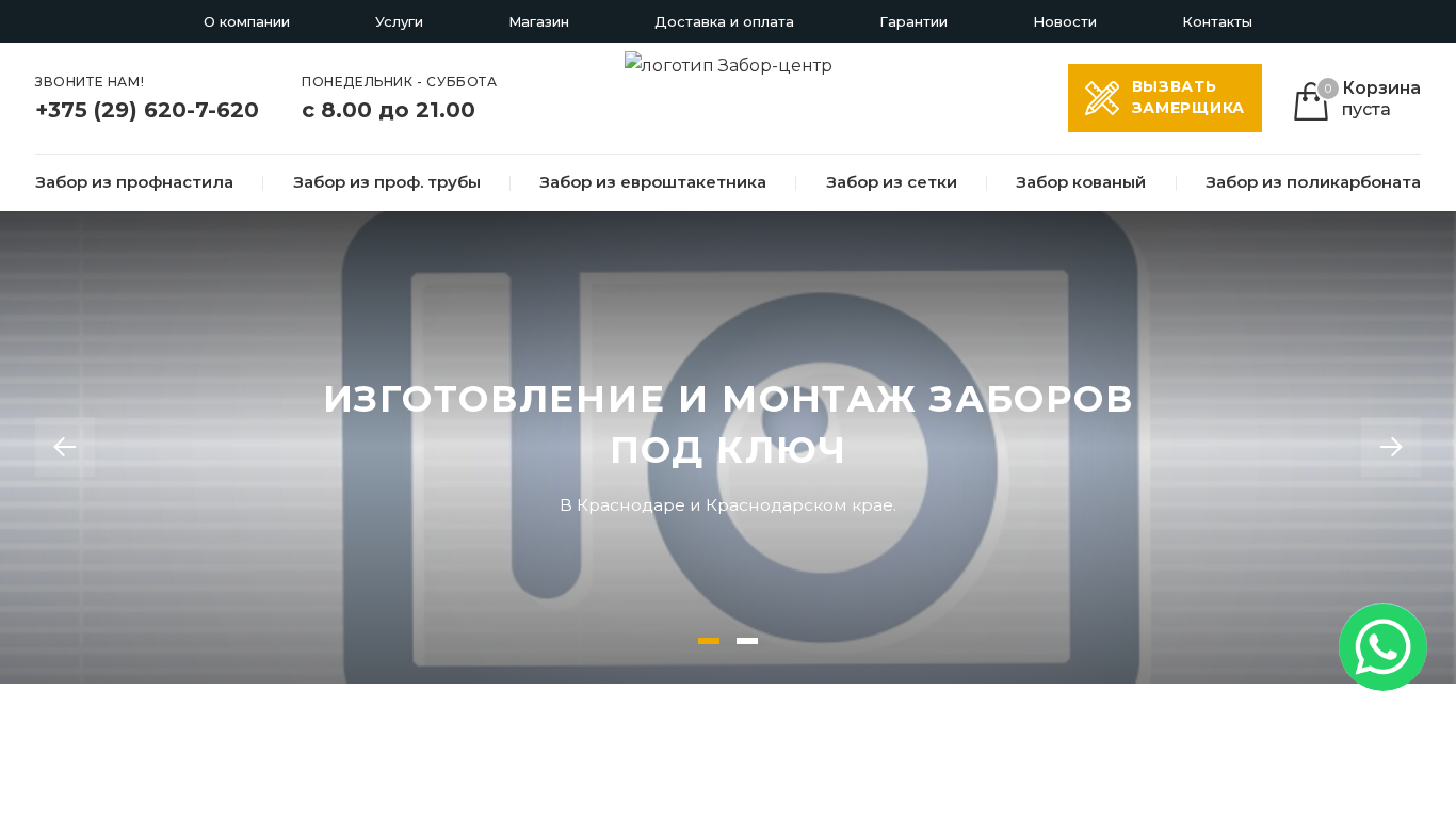 | AI-анализ | --- This website, titled "Главная | Забор-центр," offers various types of fencing services and products in Belarus. The main categories include fencing from profiled steel, profiled tubing, European fence panels, mesh, coated fencing, and polycarbonate fencing. The company also provides installation of roller shutters and control of quality. Their product range includes profiled steel, mesh, fittings, decorative elements, and various accessories. Customers can order fencing solutions with a price guarantee on services for up to 12 months. The company operates in Kransnodar and Kransnodar region. The pricing information is as follows: profiled steel fencing, installation from 600 rubles/m, production and installation from 1400 rubles/m; profiled tubing fencing, installation from 700 rub |