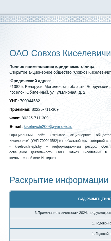 | AI-анализ | This online resource is the official website of Open Joint Stock Company (OAO) "Sovhoz Kiselevichi" (UNP 700044582). The site provides information on the activities of the agricultural cooperative located in Belarus, Bobruisk region, Bobruysk district, settlement of Yubileyny, Mirnaya Street 2. The website features announcements of annual general meetings for shareholders, as well as downloadable annual reports from 2017 to 2024. Additionally, there is a link to register and access a personal cabinet using an email address and password. |
