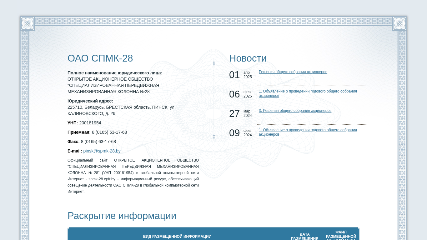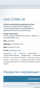 | AI-анализ | The portal spmk-28.epfr.by is the informational resource of Open Joint Stock Company (OJSC) "Specialized Transport and Mechanical Column No. 28" (OJSC SPMK-28), providing coverage of the company's activities in the global computer network Internet. The website features announcements of general shareholder meetings, resolutions, and various documents such as the annual report, auditor's report, and information on dividend payments and the share registry. The top words on the website include 'download' with 39 occurrences, 'common' with 13, 'meetings' with 13, 'shareholders' with 13, 'formation' with 10, 'registry' with 10, 'owners' with 10, 'securities' with 10, 'papers' |