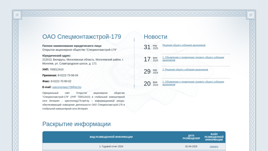| AI-анализ | The website is the official online presence of Open Joint Stock Company "Specmontajstroy-179" (UNP 700012410) located in Belarus, providing information on the company's activities. The site includes announcements of shareholder meetings, such as the recent one held on February 17, 2025, as well as the minutes of previous meetings dating back to March 2023. Additionally, users can download various documents, including the annual report for the year 2024, information on the payment of dividends, and the auditor's report. |