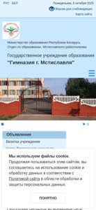 | AI-анализ | --- This website is for Mstislavl City High School (Гимназия г. Мстиславля) in Belarus. The title of the website is "Гимназия г. Мстиславля" and the description contains keywords such as 'улица' (street), '2025', 'переулок' (alley), and 'мстиславля'. The top words on the website include 'улица', '2025', 'переулок', 'читать' (read), 'далее' (further), 'йская', 'улицы', 'урицкого', 'новости' (news), 'сайта' (site), 'нская', 'график' (schedule), 'образования' (education), 'день' (day), and 'крэ |