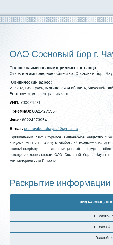 | AI-анализ | This online resource is the informational website for Open Joint Stock Company "Sosnovy Bor g. Chausy" (UNP 700024721), located in the town of Chausy, Belarus. The website provides access to the company's annual reports, with reports available for download from 2020 to 2024. Users can access the reports by entering their email address and password in the personal cabinet section of the website. The website is developed by epfr.by. |