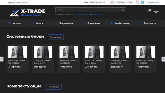 | AI-анализ | The web project X-TRADE is a computer and computer components retailer based in Mogilev, Belarus. The office is open from Monday to Thursday from 8:00 to 18:00, and on Fridays, Saturdays, and Sundays from 9:00 to 18:00. Contact details include phone numbers +375 (25) 954-53-91 and +375 (29) 662-77-84, as well as Telegram, WhatsApp, and Viber. Customers can place orders for system blocks, video cards, processors, memory, motherboards, power supplies, SSDs, HDDs, and computer cases. X-TRADE offers a configurator, information on the company, and a section for buying system blocks. The website |