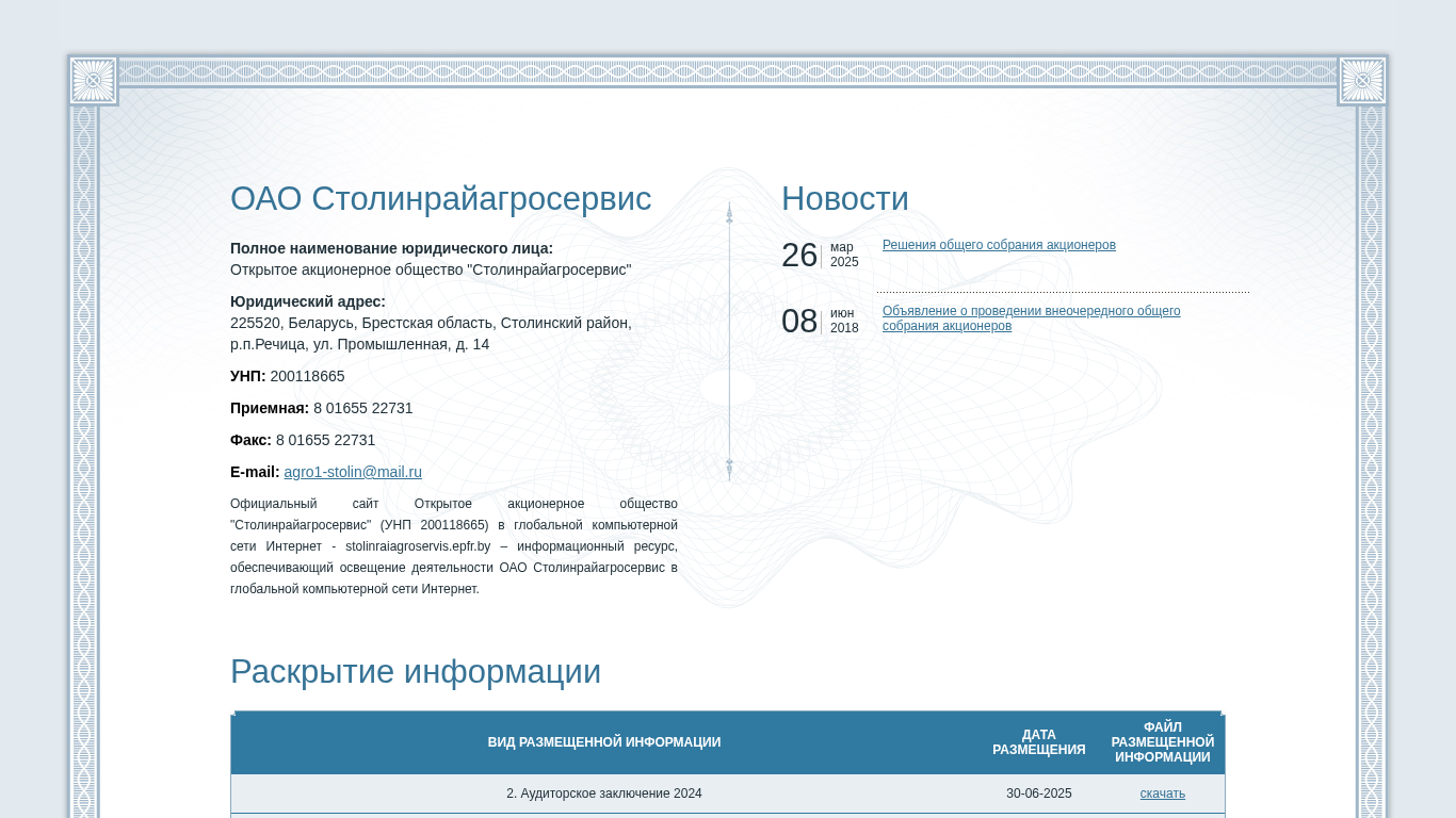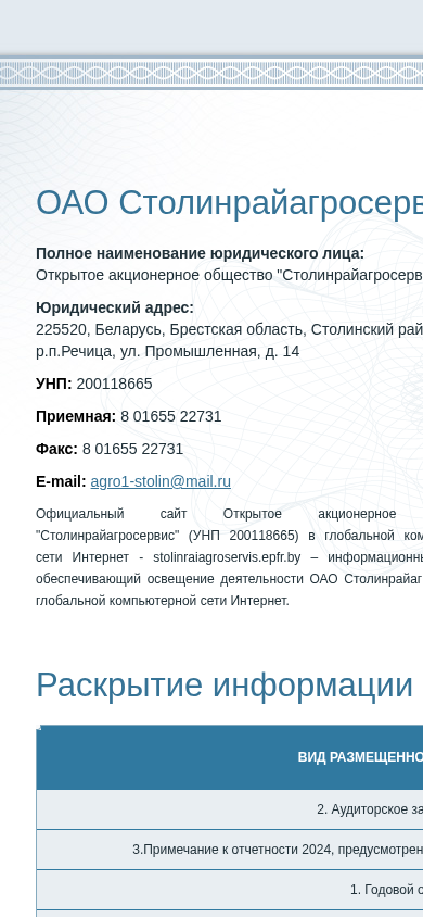 | AI-анализ | This online resource is the official website of Open Joint Stock Company (OJSC) "Stoolinraigroservis" (UNP 200118665), located in Belarus, Brest Oblast, Stoolin District, Rechitsa, Industrial Street, house 14. The website provides information on the activities of OJSC Stoolinraigroservis in the global computer network Internet. It features downloadable documents such as annual reports from 2022 to 2025, auditor's reports, notices of general shareholders meetings, and information on dividend payments. Additionally, there is a plan of work for the anti-corruption commission for the years 2024 and 2025, and a registry of securities holders. The website is accessible at stolinraiagroservis  |