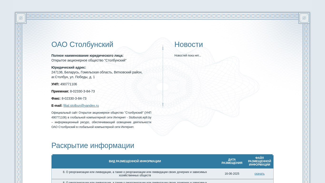 | Адрес | г.Столбун, ул. Победы, д. 1 |