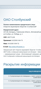 | AI-анализ | This website, stolbunski.epfr.by, is the official online platform of Open Joint Stock Company "Stobunsky" (UNP 490771106), based in Belarus. It provides access to annual reports, auditor's conclusions, and other important information about the company since 2017. Users can download reports for specific years, including auditor's reports, from the website. The website also includes information about the company's reorganization or liquidation, as well as that of its dependent entities, from 2025 onwards. The site is developed by epfr.by. |
