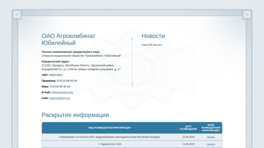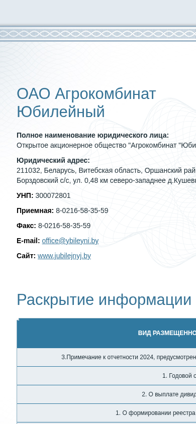 The website <www.jubilejnyj.by> belongs to Open Joint Stock Company "Agricultural Combine Jubileiny" (OAO "Агрокомбинат "Юбилейный"). The organization is located in Belarus, Vitsebskaya oblast, Orshansky district, Borzdovski selsovet, ul. 0,48 km northwest of d.Kuшеvka, d.17. The company's UNP number is 300072801. The contact details provided include a phone number (8-0216-58-35-59) and an email address (office@ybileyni.by). The website features downloadable documents such as annual reports for the years 2023 and 2024