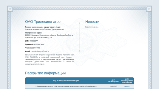 | AI-анализ | The portal oaotrilesinoagro.epfr.by is the official website of Open Joint Stock Company (OJSC) "Trileysino-agro" (UNP 700085877) located in Belarus, Dribin District, Trileysino village, Sovhoznaya Street, house 18. The website provides information on the company's activities in the global computer network Internet. It includes downloadable annual reports from 2017 to 2024 and a note on reporting for 2024, as required by Belarusian legislation. The website also features a login page for accessing a personal cabinet with registration and password recovery options. |