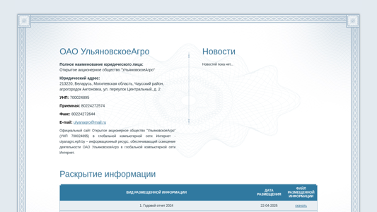 | AI-анализ | The portal ulyanagro.epfr.by is an informational resource for Open Joint Stock Company (OAO) UlyanovskoeAgro (UNP 700024895), located in Belarus, Mogilevskaya oblast, Chaussky district, agrogorodok Antonovka, ul. Pereulok Centralny, 2. The website provides access to the annual reports of the company, dated 2020, 2021, 2022, 2023, and 2024, which can be downloaded. Additionally, there is information about the company, consisting of one shareholder. The site is developed by epfr.by. |