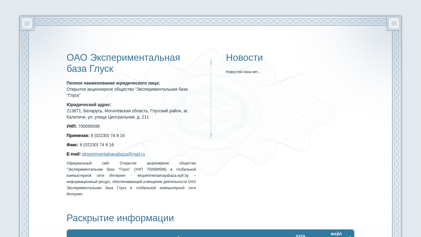 | Название / Заголовок | Экспериментальная база Глуск ОАО |