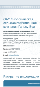 | AI-анализ | The website is for Open Joint Stock Company "Ecological Agricultural Company Gan'su-Bel" (UNP 690298393) and provides information about the company's activities in the global computer network Internet. The website offers downloads of annual reports and auditor's conclusions from 2017 to 2022. The company is located in the Borisovsky district, Minsk region, Belarus, with a juridical address at Central Street, house 112 "A", Glivin village. The website is developed by epfr.by. |