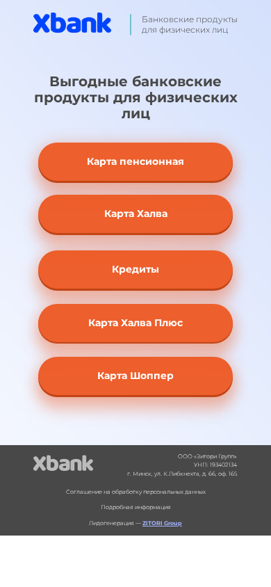 | AI-анализ | The web project "xbank.by" is a banking website offering various financial products for individual customers. The main page features sections for credit and banking products, including a test option for customers to start. The products include a Halva card, a pension card, and a Shopper card. The company behind the website is OOO "Зитори Групп" located in Minsk, Belarus. Customers are required to provide consent for the processing of their personal data to enable the bank to make decisions regarding the application of their chosen banking product. The data is used for creditworthiness and capability assessment, as well as for making calls and recording telephone conversations. The website also provides information on data processing and a form for potential clients to give consent to the bank for the processing of their personal data. |
