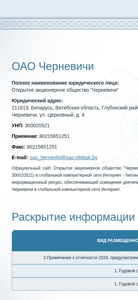 | AI-анализ | The web project 'Черневичи ОАО' (Open Joint Stock Company 'Chernevichi') is an informational resource representing the activity of the company in the global computer network Internet. The site provides access to company news, annual reports, and registration to a personal cabinet for users. The legal name of the organization is 'Открытое акционерное общество "Черневичи"' (Open Joint Stock Company 'Chernevichi') and its UNP (Taxpayer Identification Number) is 300020521. The company's address is in Belarus, Vitebsk region, Głuboksky district, the village of Chernevichi, ul. Tserkovny, d. 4. The contact information includes a phone number (802156512 |