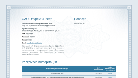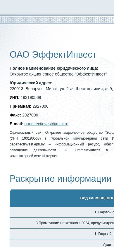 | AI-анализ | The website oaoeffectinvest.epfr.by is the official online platform for Open Joint Stock Company (OAO) "ЭффектИнвест" based in Belarus. The site provides access to various financial reports and auditor's conclusions for the company, available for download, including annual reports from 2009 to 2025. Users can access information about the company's strategy and development, as well as find contact details for the organization. The site is developed by epfr.by. |