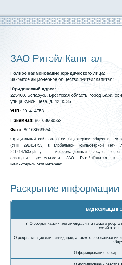 | AI-анализ | The website 291414753.epfr.by is the official online platform of Closed Joint-Stock Company "RiteylCapital" (UNP 291414753) based in Baranovichi, Belarus. The website provides information on the company's activities and features announcements for shareholder meetings, including in-depth reports of past and upcoming general assemblies. Users can download documents related to share ownership registration, reorganization or liquidation, and other company-related matters. The website is operated by the Electronic Documentation and Registration System (EPRF). |