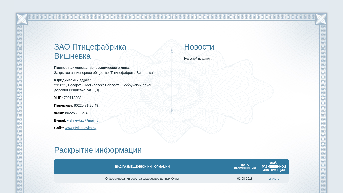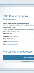 | AI-анализ | The portal <Птицефабрика Вишневка ЗАО> is a website for a poultry farm named Птицефабрика Вишневка, which is a closed joint-stock company (ЗАО) based in Belarus, specifically in the Bobruisk district of the Mogilev region, located in the village of Вишневка. The company's UNP number is 790118808 and their contact information includes a phone number (80225 71 35 49) and an email address (vishnevka8@mail.ru). The site, developed by epfr.by, includes a news section but currently has no news posts. Users can access a personal cabinet by providing their email address and password. Registration is required for new users. The site was last updated |