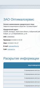 | AI-анализ | This online resource is the official website of "Оптималсервис ЗАО" (Optimal Service Ltd.), a Belarusian company. The site provides information on the registration of owners of securities, specifically in the context of forming registries. The site offers multiple downloadable documents, each with a specific date, related to the formation of these registries dating back to March 2021. The site also includes contact information, including a phone number, fax number, and email address, for inquiries or registrations. The site is registered under the .by domain with the UNP number 200645602 and is located at the juridical address in Cobrin, Belarus.  |