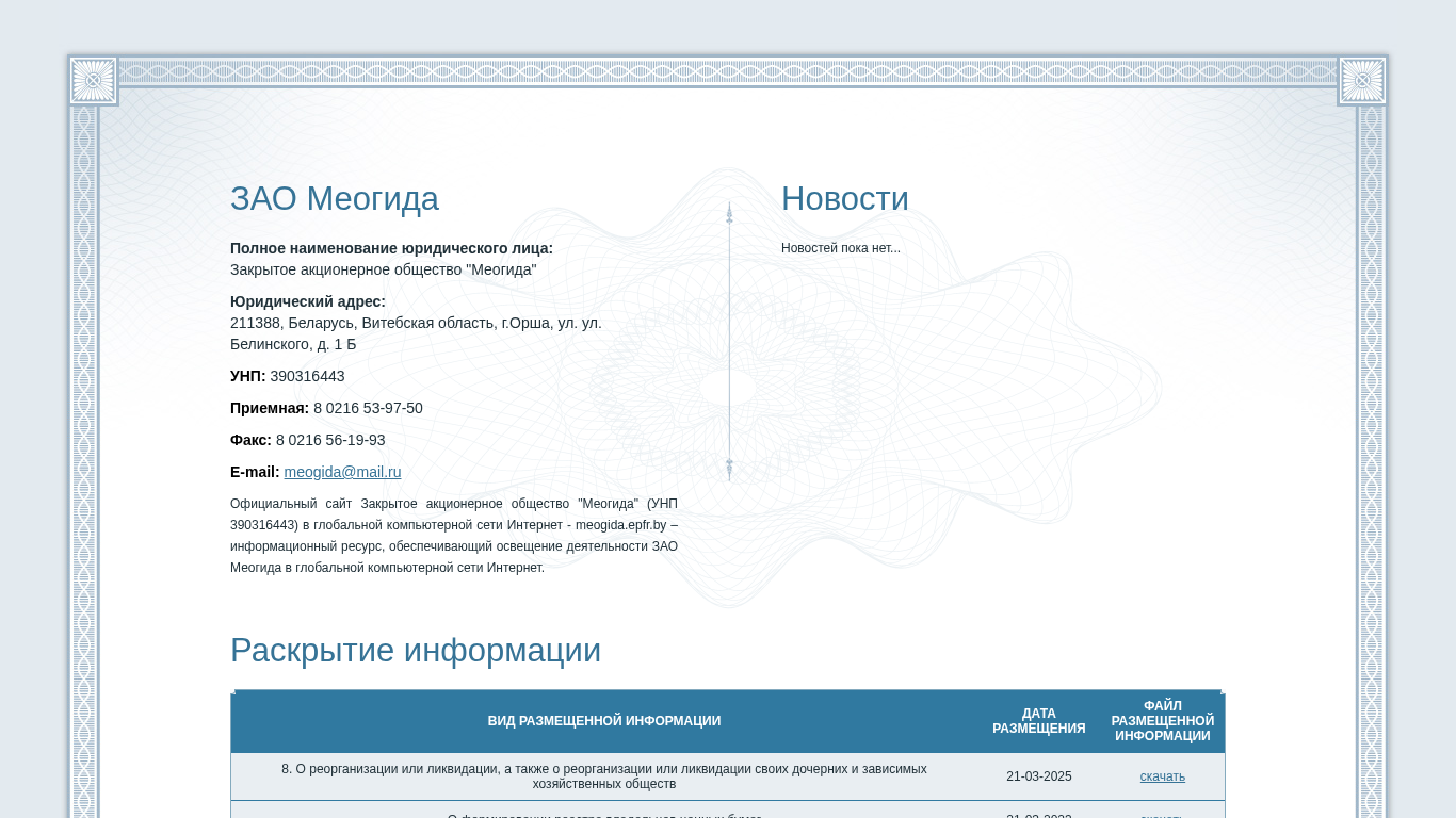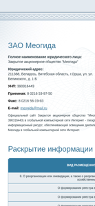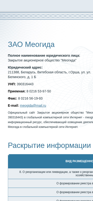 | AI-анализ | The web project "Meogida ZAO" is the official website of the Closed Joint Stock Company "Meogida" (UNP 390316443) located in Belarus, Vitsebsk region, Orsha city, Belinskaya street, house 1. The website provides information on the company's activities in the global computer network Internet. Various documents, including information on the reorganization or liquidation of the company and its dependent entities, as well as the formation of shareholder registries and dividend payments, are available for download. Access to the personal cabinet requires an email address and password. |