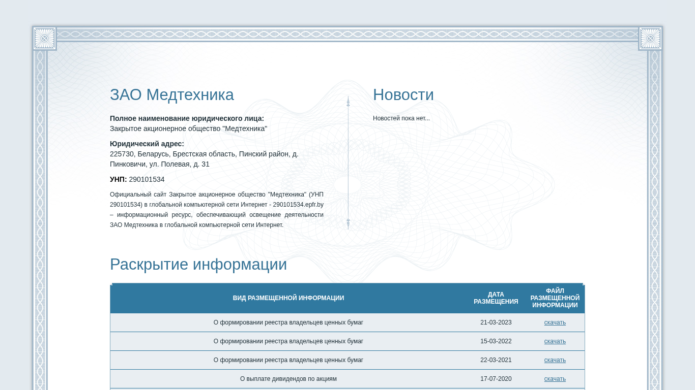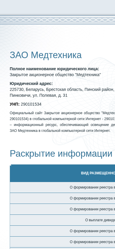 | AI-анализ | This website is the official online presence of Closed Joint-Stock Company "Medtechnica" (UNP 290101534), located in Belarus. It provides information about the company's activities in the global computer network Internet. The site offers downloadable documents related to the formation of shareholder registries and dividend payments. These documents include records from March 2018 to March 2023. Users can access the personal cabinet by entering an email address and password. Registration is also possible for new users. The website was developed by epfr.by. |