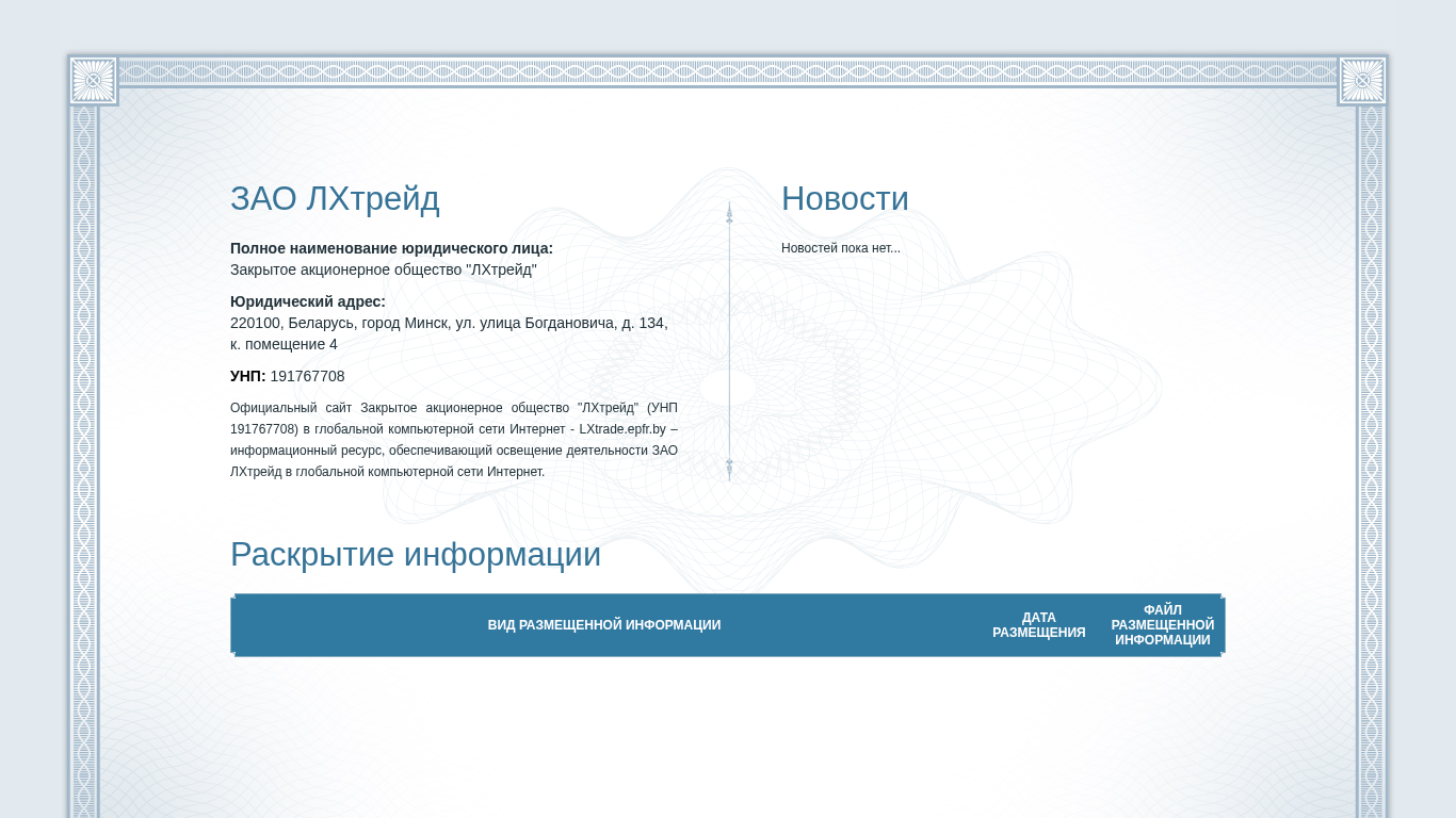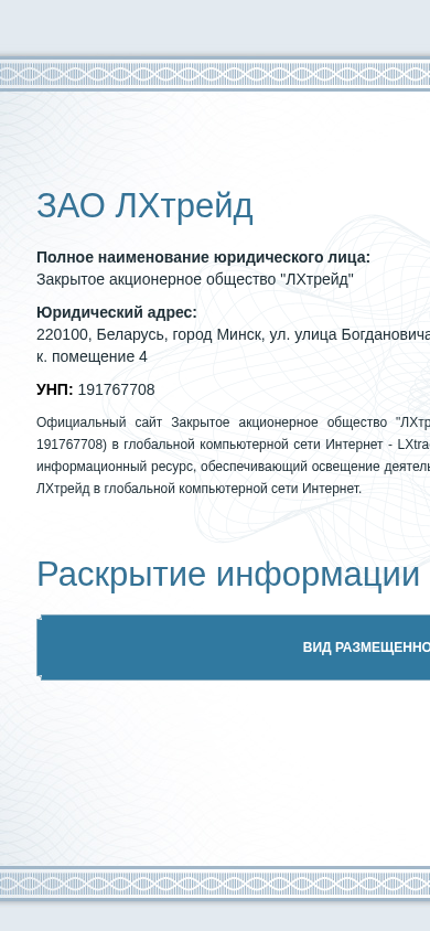 | AI-анализ | This online resource, LXtrade.epfr.by, is the informational website for Closed Joint-Stock Company "ЛХтрейд" (UNP 191767708), located in Belarus, Minsk, Ul. Bogdanovich, 134, k. 4. The website provides information about the company's activities in the global computer network Internet. It includes news, registration, login, email, and password features. The official email address for accessing the personal cabinet is provided, along with a password recovery function. The website was developed by epfr.by.  |