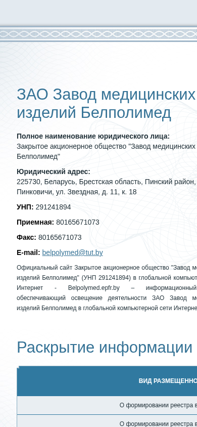 | AI-анализ | The web project "Belpolymed.epfr.by" is the informational website for the Closed Joint Stock Company "Belpolymed" (UNP 291241894), a manufacturer of medical devices located in Belarus. The site provides information on the company's activities and offers downloadable documents related to the formation of the shareholders' register. The site was developed by epfr.by. |