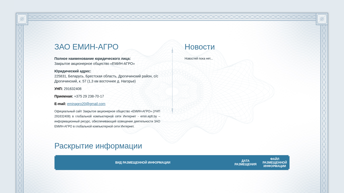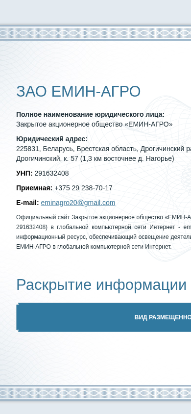 | AI-анализ | This website is the official online presence of Closed Joint Stock Company (CJSC) "EMIN-AGRO" (UNP 291632408). The site provides information about the company in the global computer network Internet. The homepage includes contact details such as a phone number and email address. Users can access a personal cabinet after registration with an email address and password. The site was developed by epfr.by. There is currently no news section on the website. |