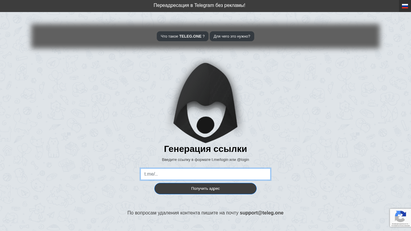 | AI-анализ | The portal Teleg.one is a Telegram redirection service that allows users to redirect to any Telegram resource (group, open or closed channel, contact, chat) or article on telegra.ph. With the help of this service, users can create a link to a Telegram channel that will work independently of Telegram's blockages. Old t.me/* links do not work for most of the Russian population. To avoid losing traffic due to blockages, this service was created. It functions similarly to t.me/* (it opens the Telegram application with the specified channel/chat), but it works for all users. To use the service, simply copy the link to your channel (or invitation link to a closed channel, chat, contact, or article on Telegraph) into the box below and click "Get Address". The generated link will be in the format t.me/login or @login. For in |