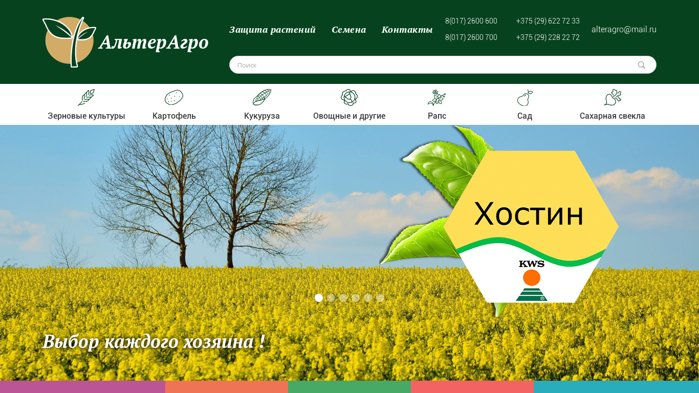 | AI-анализ | This website, titled "АльтерАгро — Средства защиты растений - семена и средства для защиты растений", is an agricultural business offering a wide range of plant protection products. The company OOO 'Альтерагро' provides seeds and various means of plant protection including pesticides such as herbicides, fungicides, and insecticides, as well as growth regulators for plants. The website lists several contact numbers and email addresses for inquiries, including numbers for Belarus and Russia. The products offered include protection for crops such as corn, potatoes, and sugar beets, among others. The website also mentions the availability of micronutrients for corn cultivation and high-concentration nutrients for use in water with very low temperatures. The website states that it is the best leaf fertilizer for |