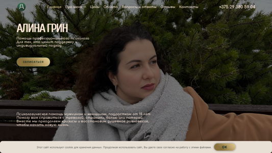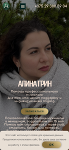 | AI-анализ | The web project "Практический психолог в Минске Алина Грин" is a professional psychology practice based in Minsk, Belarus. It offers psychological assistance to adults and teenagers aged 15 and above, both online and in person. The website contains information about the psychologist, Alina Grin, her approach, services, and fees. The target audience includes individuals seeking support and personalized attention. The practice focuses on helping clients deal with anxiety, fears, pain, and loss, and aims to help them overcome crises and restore emotional balance, enabling them to start a new life. The psychologist's experience includes both personal and professional challenges, such as divorce, infidelity, financial losses, and the birth of a child with special needs. Her approach to psychology is informed by these experiences. The website includes sections for booking appointments, frequently asked questions, client testimonials |