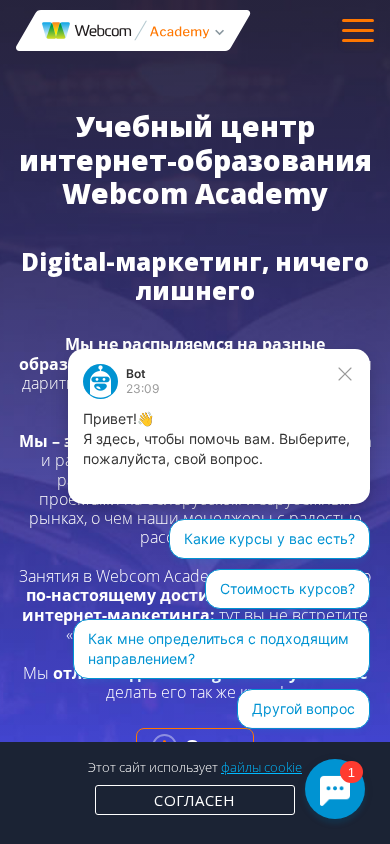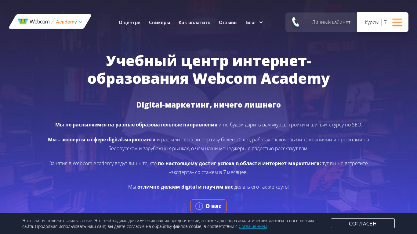 | SEO-описание | Профессиональные курсы в Минске от Webcom Academy ✔️ Обучающие курсы в направлениях: SEO, интернет-маркетинг, контекстная реклама, веб-аналитика, SMM, нейросети ⭐ Онлайн-обучение на образовательных курсах в Минске |