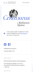 | AI-анализ | This website is a sexology consultation service operated by Irina Yakubovskaya. The homepage displays a message inviting visitors to wait for new consultations, and offers a link to the Instagram account of Irina Yakubovskaya for more information. The website is registered under the name and UNP (identification number) of Irina Yakubovskaya, and was issued on July 4, 2011 by the Fruunzensky District Executive Committee of Minsk. The privacy policy and terms of use are stated, and the website accepts various payment methods and operates Monday to Friday from 10:00 to 20:00. The contact information for Irina Yakubovskaya is provided, including a phone number and email address. |