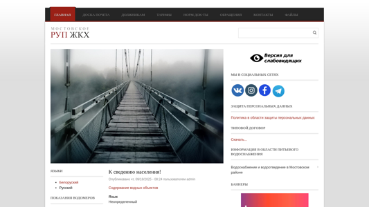 | AI-анализ | This online resource is the official website of Мостовское РУП ЖКХ (Mostovskoe RUP JKH), a utility company responsible for providing communal services in the Mosty region, Belarus. The site includes information for residents about various topics such as water utilities, registration of household pets, and office hours for meetings with administrative personnel. The language of the site is Russian, but some content is also available in Belarusian. The site contains sections for "Доска почета" (Dolzhnikam, or Debtors), "Списание пени" (Penalty Waiver), "Тарифы Норм док-ты" (Tariffs and Norms), and "Обращения" (Complaints), among others. The site also includes a search function and contact information for the utility company. On September |