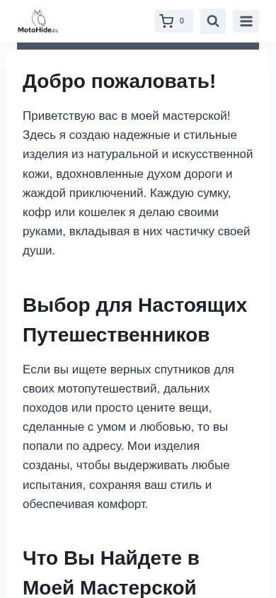 | AI-анализ | --- This online resource, titled "MotoHide" (<https://bagbro.by/>), is an e-commerce website specializing in the creation and sale of durable and stylish bags and accessories made from natural and artificial leather. The site's description highlights its offerings as ideal for motorcycle travelers, long trips, and those who appreciate well-made items. The homepage includes a catalog, information on payment and delivery, contacts, account management, and a shopping cart. The site's master artisan welcomes visitors, emphasizing the handcrafted nature of each product and their ability to withstand various adventures while maintaining style and comfort. Available items include motorcycle bags, waist packs, cross-body bags, and various smaller accessories. The artisan uses both natural and synthetic high-quality leather to cater to various needs and preferences. Each item is fully handmade by the artisan, ensuring uniqueness |