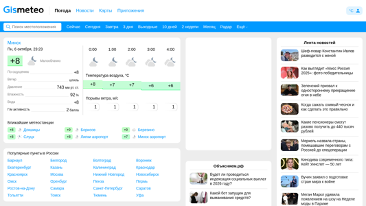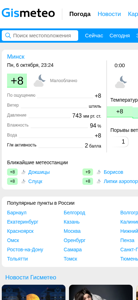 | AI-анализ | The website GISMETEO provides accurate weather information and detailed weather forecasts for today, tomorrow, and the next three days for all populated places in Russia, as well as worldwide. Keywords include weather, forecast, Russia, and various timeframes. The top words are 'России' (Russia) and 'году' (year), suggesting a focus on Russian weather. The site offers features such as radar, news, and archives, and allows users to save preferred units, locations, and data. The homepage displays the current weather in Minsk, Belarus, with options to view forecasts for the next several days and nearby locations. Users can also access popular weather stations in Russia and create a personal account for additional features. |