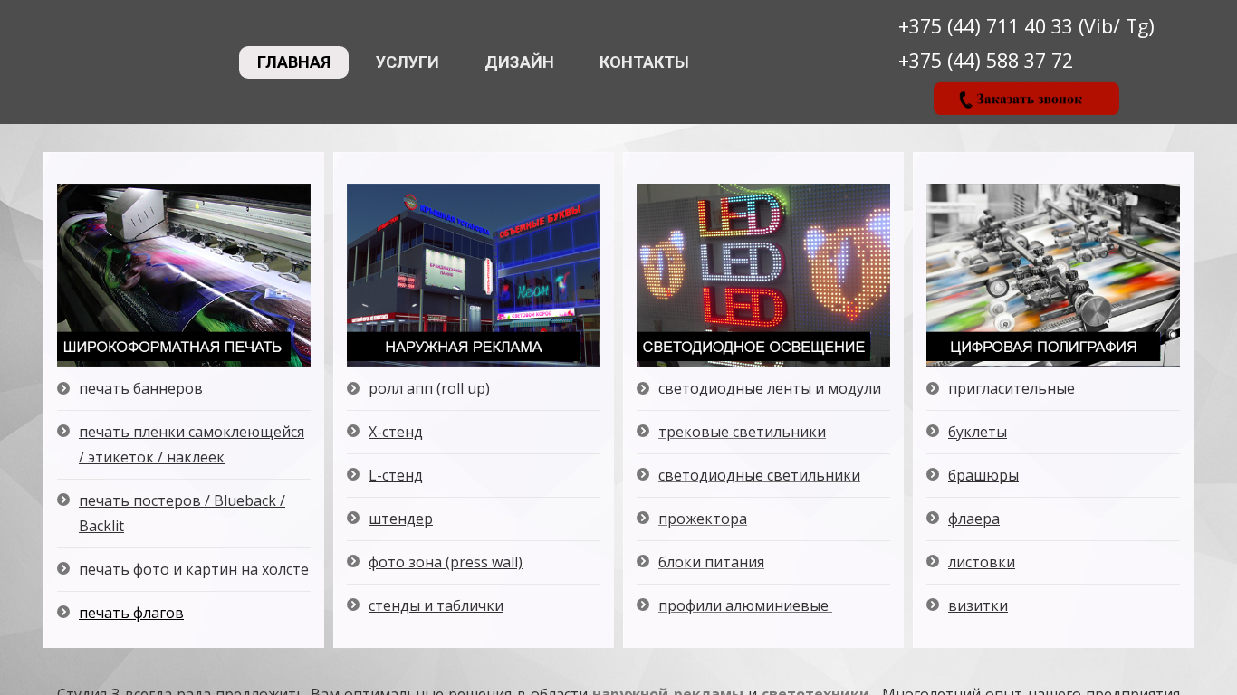 | SEO-описание | Наружная реклама Широкоформатная печать Светодиодная лента Светодиодные светильник Полиграфия в Минске по низким ценам быстро и качественно, регулярные акции и бонусы постоянным клиентам. Обращайтесь, мы всегда рады помочь и готовы предложить Вам оптимальное решение. |