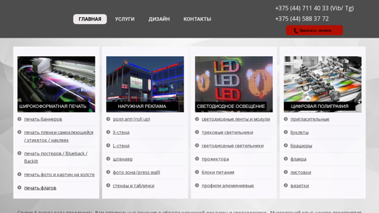 | Ключевые слова | Наружная реклама в Минске Вывески изготовление световые короба объемные буквы Широкоформатная печать печать баннеров печать постеров светодиодная лента блоки питания светодиодные светильники в Минске |