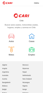| AI-анализ | The title and description indicate that this website is a search engine for used cars, motorcycles, homes, jobs, and careers in Chile. The top words suggest that the website also targets Spanish-speaking users from other countries. The fragment shows the website's menu and a list of countries, suggesting that it may have international reach. The domain is .cl, which is the ccTLD for Chile. |