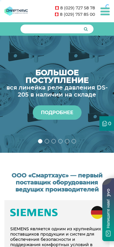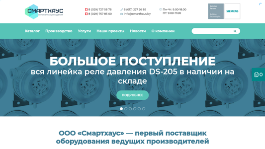 | AI-анализ | This online resource, titled "Главная страница | Смартхаус" (Homepage of SmartHaus), is a website specializing in building automation, heating, ventilation, and air conditioning systems. SmartHaus is a supplier for Siemens, S+S Regeltechnik, and CAREL. The website offers a catalog of equipment, including regulators, valves, sensors, thermostats, controllers, transformers, and more. Users can place requests for products in the catalog section. The phone numbers for contacting the company are (029) 727 58 78, (029) 757 85 00, and (017) 227 26 85. The operating hours are Monday through Thursday from 9:00 to 18:00 |