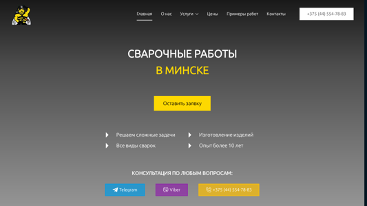 | AI-анализ | The web project "Сварочные работы в Минске (Welding Works in Minsk)" offers various types of welding services in Minsk, Belarus. The keywords related to this project include 'сварка' (welding), 'работ' (works), 'ремонт' (repair), 'резка' (cutting), 'стоимость' (prices), and specific types of welding such as 'полуавтоматическая' (semi-automatic), 'аргонодуговая' (argon arc), 'ручная дуговая' (manual arc), and 'плазменная' (plasma). The project also mentions 'металла' (metal) and 'цены' (prices). The contact information includes a phone number '+375 (4 |