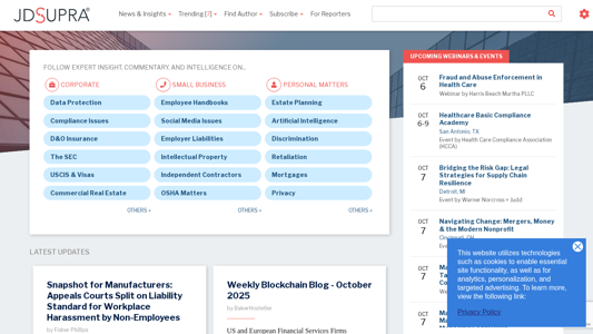 | AI-анализ | The website JD Supra is a daily source of legal intelligence for business and personal matters, distributing news, commentary, and analysis from leading lawyers and law firms. Keywords associated with the website include legal documents, forms, court filings, research, and information. The top words on the website are "the," "and," "more," "October," "for," "LLP," "2025," "law," "compliance," "event," "conference," "webinar," "new," "October," "American Institute," "ACI," "that," and "rule." The website offers a range of news topics, including labor and employment, finance and banking, intellectual property, health and healthcare, environmental issues, business insurance, commercial real estate, corporate taxes, immigration, securities, and personal matters. Users can access the latest updates, trending topics, and popular reads on |
