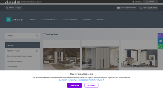 | AI-анализ | --- This online resource is the website of ZABERI.BY (ЗАБЕРИ.БАЙ), a home furniture company. The site features a wide range of furniture products: kitchens, wardrobes, bedrooms, walls, living rooms, sofas, cabinets, tables, and other items. A large selection of wooden furniture is available. Contact information for ZABERI.BY includes a phone number, Viber, WhatsApp, and Telegram. The site is available for selling on Deal.by, and offers a cart and 51 customer reviews. The company is based in Minsk, Belarus. Products are in stock and can be purchased. Popular items include a forest decogroup bed called 'Сабрина 4С/Сабрина 4.1С' (satin), the 'Брандо' wardrobe, the 'Ла |