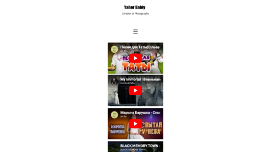 | AI-анализ | This website, titled "FEATURED | DOP" and described with keywords such as "Detskaya fotografiya" (Children's photography), "Semeynaya fotografiya" (Family photography), "Fotografiya" (Photography), "svadebnaia fotografiya" (Wedding photography), "sjemka koncertov i meropriyatii" (Concert and event photography), belongs to Yahor Babiy, a Director of Photography. The top of the page introduces "Yahor Babiy Director of Photography" and offers a link to "основному контенту" (main content). The main content showcases "Featured Work," which includes "Concert," "Drone," "Interview," "Doc," and "Studio" projects. Additionally, there are 14 "W |