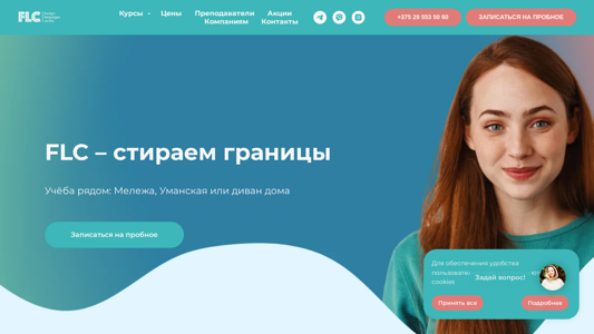 | AI-анализ | This website is a language center named FLC offering courses in English, French, German, Chinese, Italian, and Spanish. Qualified teachers, individual approach, and a comfortable atmosphere are promised. Visitors can sign up for a free trial lesson and leave their contacts to be contacted within 15 minutes. The website also provides details on courses, prices, teachers, promotions, and contacts. The use of cookies is mentioned for site convenience and improved functionality. The domain is cic.by. |