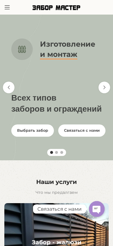 | AI-анализ | The web project "Zabor Master" offers quality production and installation of various types of fences, gates, and canopies in Goeme and the surrounding area. The contact information includes phone numbers and an email address. The website provides sections for "About Us," "Contacts," and a menu, along with offerings for different types of fences such as "жалюзи" (aluminum fence), "забор из профлиста" (profiled fence), "железобетонный забор" (concrete fence), and "навесы и козырьки" (canopies). The website also offers custom solutions, and there is a section for "Our Services," which includes "Забор жалюзи" (aluminum fence), "Забор из штакетника" (wooden fence), "Железобетонный забор" (concrete fence |