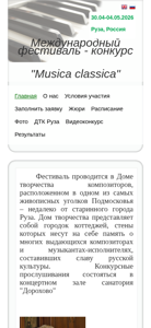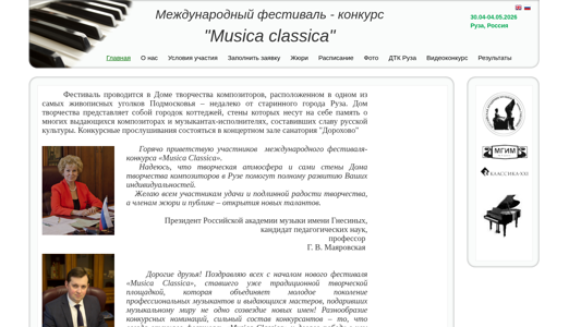 | AI-анализ | The web project "International Music Festival-Competition 'Musica Classica'" is a Russian-language website dedicated to an annual international music festival and competition held in Ruza, Russia, from 30.04-04.05.2026. The website is powered by 1C-Bitrix CMS and uses PHP. The site includes sections for information about the festival, registration, jury, schedule, photo gallery, and video contest results. The festival takes place at the House of Composers, a cottage settlement in a scenic location near the historic city of Ruza, known for its rich history of prominent composers and musicians. The competition features various categories and attracts both emerging and established musicians. The festival's president is G.V. Mayarovskaya, a candidate of pedagogical sciences, professor at the Russian Academy of Music named after Gnesin. The |