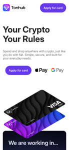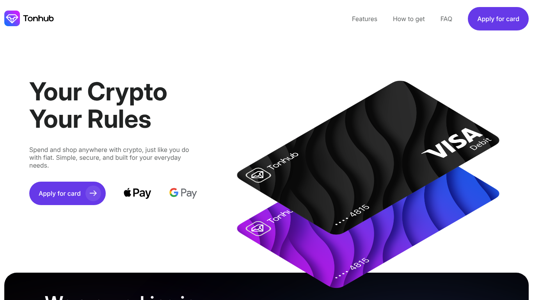 The portal Tonhub is a financial platform that enables users to spend and shop using cryptocurrencies with the convenience and security of traditional fiat transactions. The application, which requires download and identity verification, allows users to apply for a virtual card and instantly convert crypto to fiat for purchases or transfers. The card can be added to Apple Pay and Google Pay for contactless payments, and can be used at over 90 million merchants worldwide. The platform also offers features such as easy top-up, card management settings, and transparent fees. Users can download the app by scanning a QR code and follow the instructions to get started. The card issuance is free, with a monthly limit of 50,000 € and a transaction fee of 1.5%. The platform also offers a FAQ section to answer common questions.