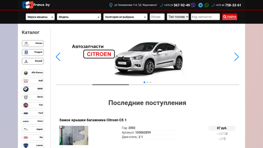 | AI-анализ | The website auto-france.by is a used parts dealer based in Minsk, Belarus, specializing in French car brands such as Peugeot, Renault, and Citroen. The company offers a wide range of used parts imported from Europe, ensuring customers access to high-quality components for their French vehicles. The website provides a catalog for browsing and purchasing parts, as well as contact information for inquiries and orders. The store is located on Timiryazev Street 114 in the "Zhdanovichi" trade district and can be reached via phone at +375 29 567-92-49 or +375 44 758-33-61. |